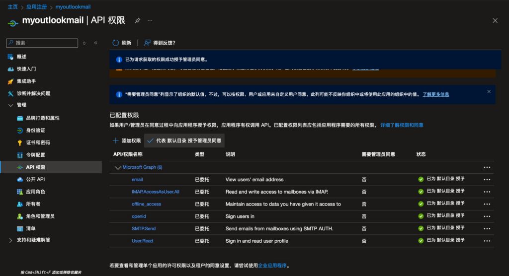 获取密码后,选择右侧的api权限,之后选择Microsoft Graph其中的委托权限,并勾选其中的IMAPSTMP,添加后点击 代表默认目录,授予管理员同意