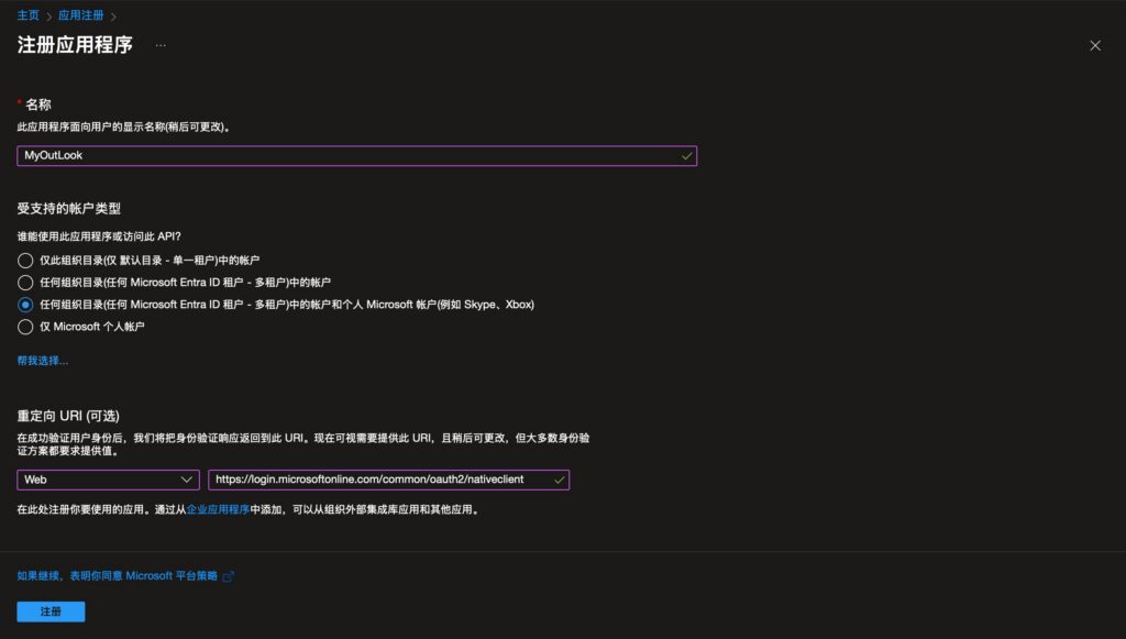 在应用注册页面,点击新注册,之后填写应用的名称,账户类型等信息。如果只是自己这一个账户使用的话,选择单一租户即可。而我因为工作和私人分别有不同的Outlook邮箱,所以我需要选择 多租户和个人账户