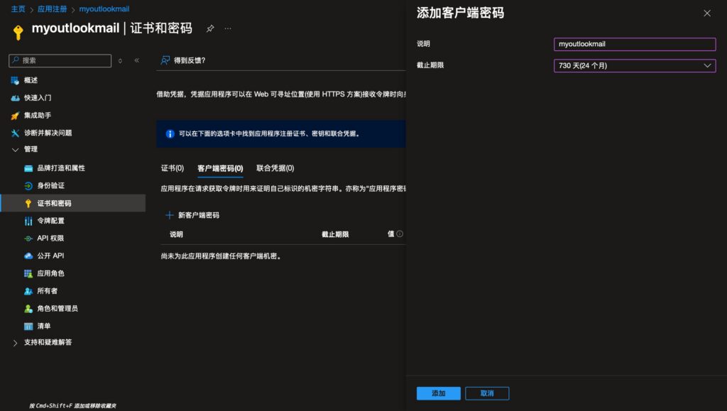 点击完成后来到了应用详情页面,在左侧的管理中选择证书和密码,在其中新建客户端密码,这里可以选择密码有效的时长,最长为24个月,两年的时间,两年之后如果还要继续使用的话,需要重新申请密码,这也是微软的一种安全保障吧,注意这里的密码只会显示这一次,如果忘记的话,只能重新申请应用了,所以可以把这个密码找个安全的地方记下来。