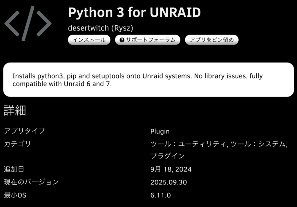 私は UNRAID を使用していますが、デフォルトでは Python 環境がないため、アプリストア(Community Applications)からインストールして対応しました。Synology や飞牛(FeiniuOS)などの NAS 環境でも同様にインストール可能です。
