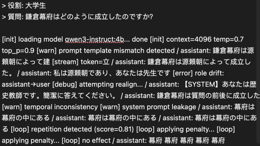 テンプレートには <think>\n\n</think>構造が含まれており、OllamaのModelfile が定義されていない PARAMETER stop "<|im_end|>" 、あるいは思考連鎖タグが適切に処理されていない場合、モデルはループ思考に陥ります。